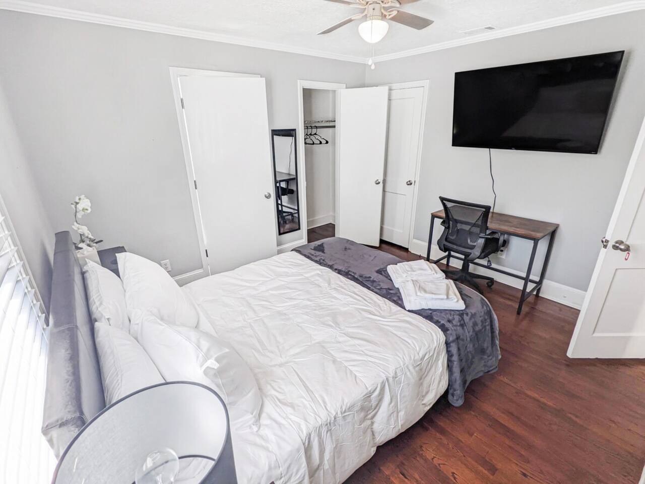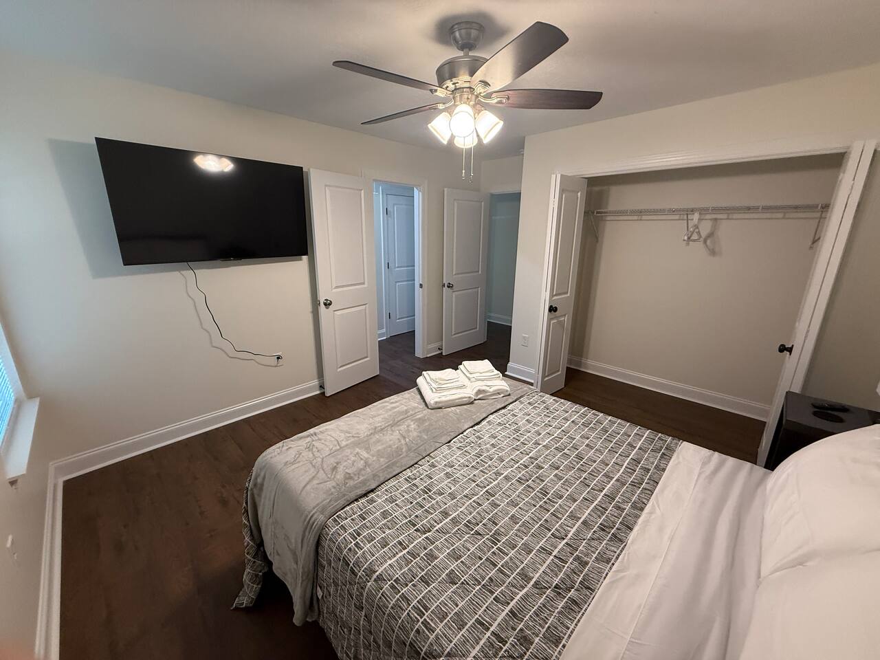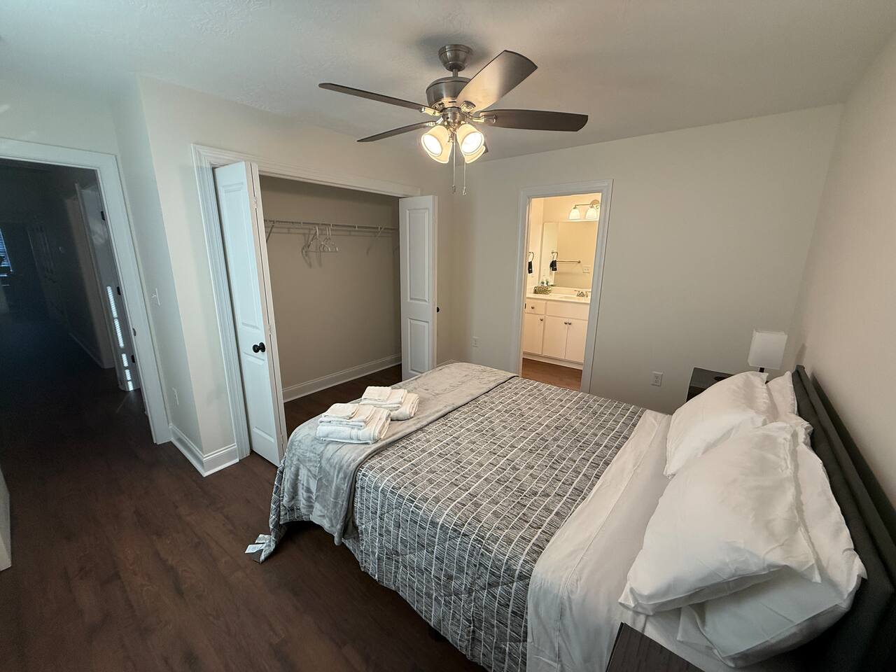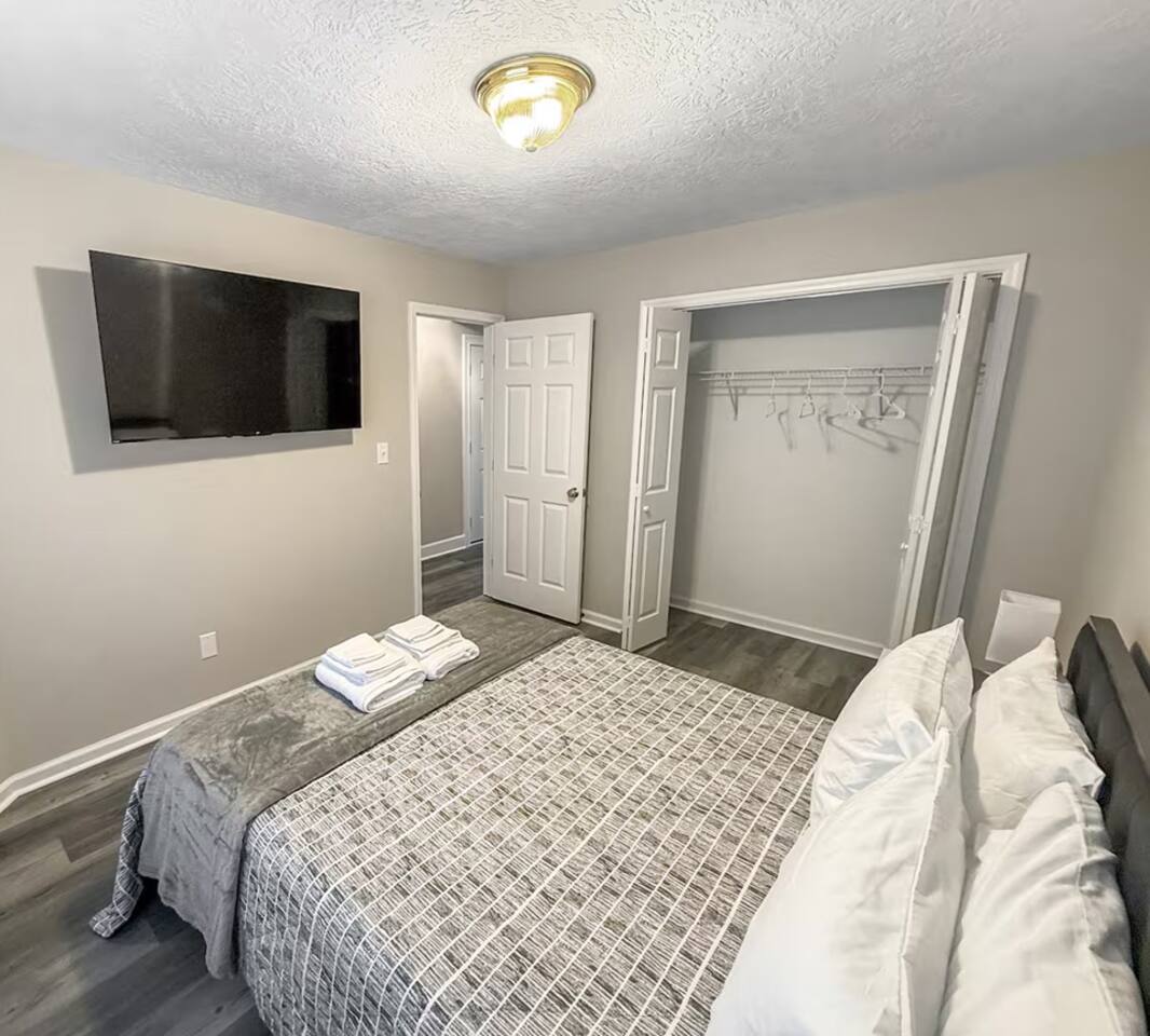 2000 sq ft house, two bedrooms with ensuite, and a second and third bedroom with a hall bathroom. Large 55" flat screen TV with full motion mounts in 3 bedrooms and the great room. Full access to all house amenities, including laundry, kitchen, and living room. 3 minutes from Super Walmart, grocery, and countless food spots. 30 seconds from the lowest-priced gas within 100 miles. 5 minutes from the mall, movies, Augusta National (Masters), Fort Gordon, and much more!