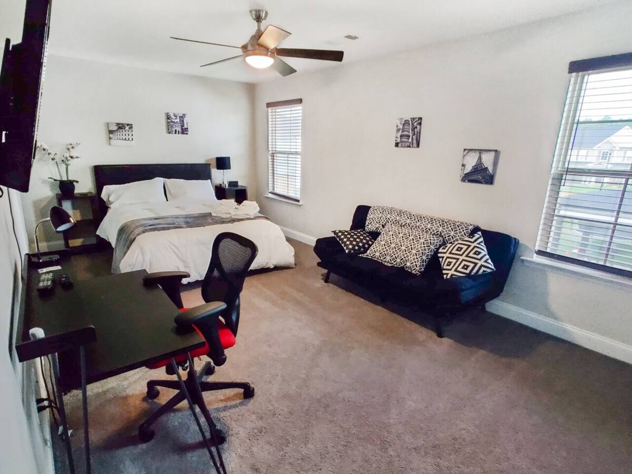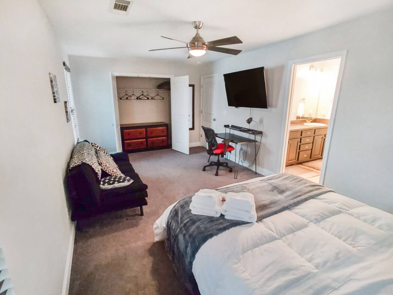 Information about our Suites: 1. The listing you are Booking is a private Suite, with an attached shared bathroom. 2. There will always be Hosts / Guests in the house. 3. The host will always have a small dog on site, if you see them out and about say HI. 4. Other guests may also have pets with them. 5. You have access to all other amenities as shared with other guests. 6. The Suite is also not suitable for infants or children. 7. The suites as well as the house are pet friendly. 8. Only 1 car per Guest Suite is allowed, no street parking. 1. There are cameras covering the driveway and entryway that record only during motion detection. The Driveway camera is used to verify the number of guests that enter the home, to check when guests arrive and leave for cleaning purposes and for the general safety and protection for crimes that may be committed on the property. 2. Parties, events, or gatherings of any kind are NOT ALLOWED without prior approval. Use the Contact Host button to contact us before you book as no refunds will be given if you book and then don't get approved! Approval is contingent upon the following terms: • A refundable $500 deposit must be submitted. Upson satisfactory post-stay inspection, the deposit will be returned minus any damages. • All guests must be included on the reservation guest count, whether or not they stay the night. • Only 1 vehicle will be allowed, due to street parking laws and HOA regulations. All additional guests must arrive via carpool, uber, shuttle, ect. If you misuse our home, you will be charged a $200 fee to pay the HOA fine and $1000 if law enforcement is called. 3. We verify how many guests enter and stay in the home. If you have misrepresented the number of guests on your reservation, you will be charged extra. Please alter your reservation immediately to correct guest counts on your reservation and be charged appropriately. 4. THIS HOUSE IS NON SMOKING. This includes cigarettes, marijuana, and any other substances that create smoke or vapor. If the cleaners arrive and detect a smoky odor of any kind, you will be charged an additional $100 to remove the odor. 5. Street Parking is NOT permitted. If you have extra vehicles, DO NOT park on our grass or line our street with your vehicles. Please park them in a public parking lot elsewhere and carpool to the house. This is a residential neighborhood. If you park vehicles on the street, you may be charged a $100 fee to pay the HOA fine. 6. Our home is thoughtfully furnished for your comfort. Please treat our things as if they are your own. You are responsible for all furnishings during your stay. If you break, misplace, throw away, steal, or permanently stain anything, you WILL be charged for it, and we inventory everything before and after every stay. • Our white towels are for drying your bodies only. • Please use our makeup towels for makeup removal. • Eat and Drink in the bedrooms at your own risk. • If you have kids, we recommend using your own blankets, as our white comforters are expensive to replace.